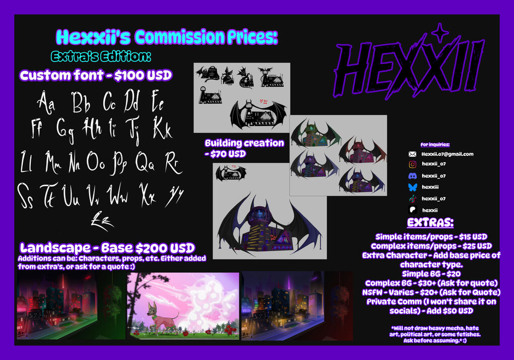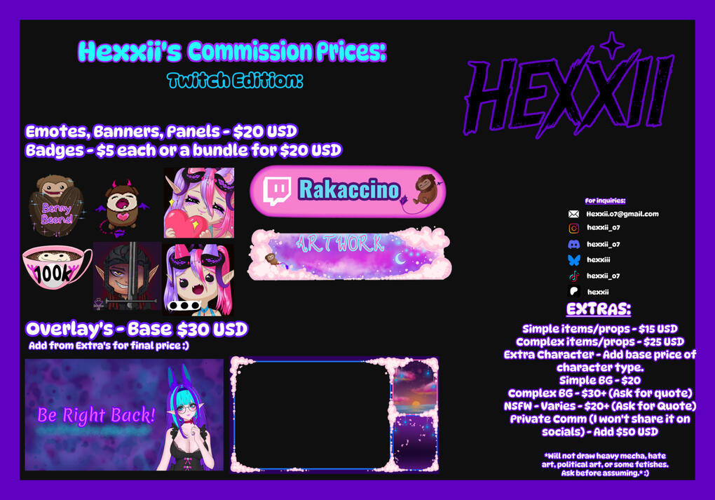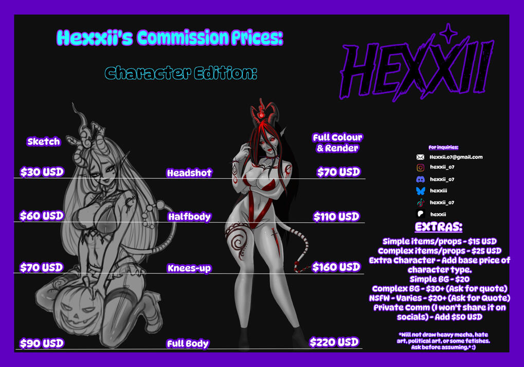 Base pricing and extras are detailed on my website and discord.
